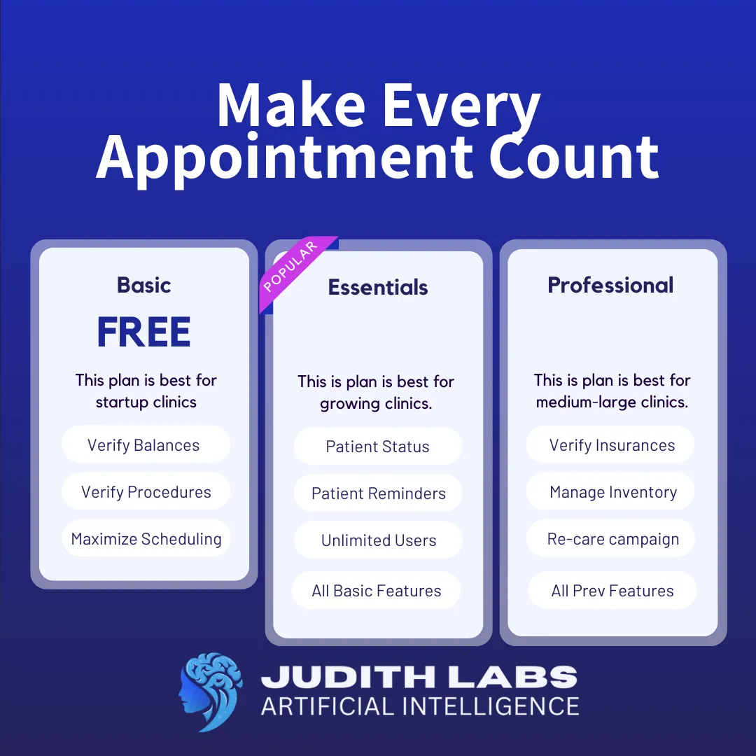 Introducing PreCheck🎉 – the smarter way to streamline patient intake. Our powerful AI-driven solution takes the hassle out of verifying patient balances, identifying pending procedures, and confirming insurance details — all before the appointment. Be among the first to experience effortless front office automation. Leave your name, email, and phone number below, and we’ll notify you the moment JudithAI PreCheck goes live!